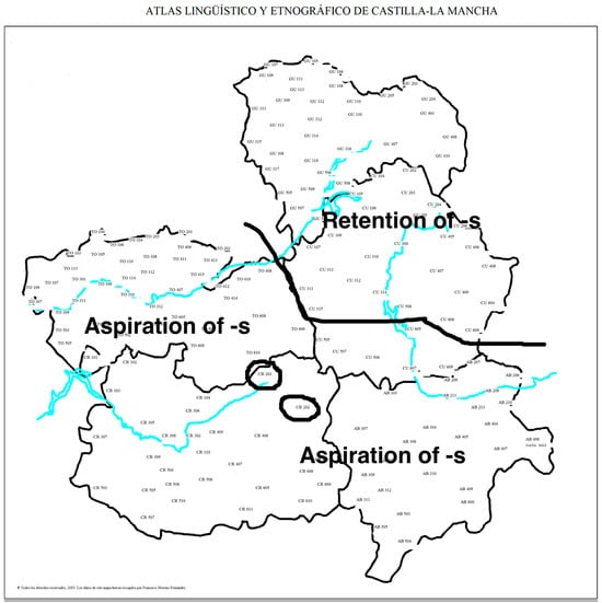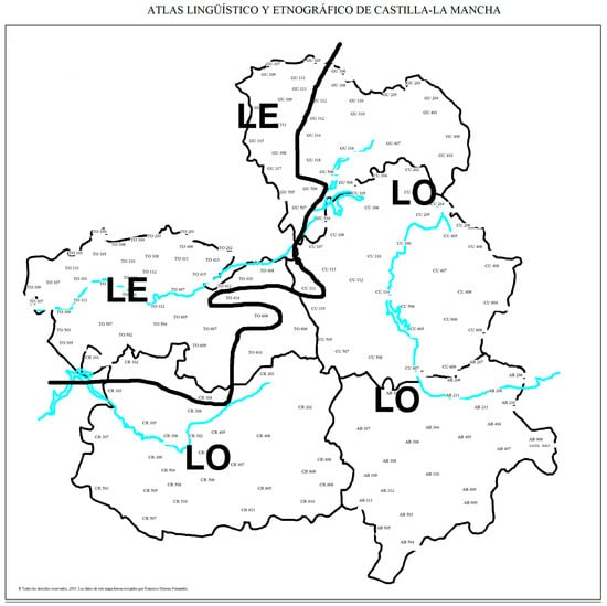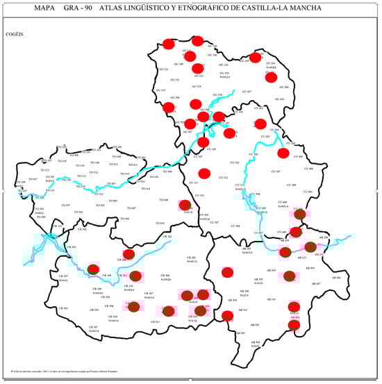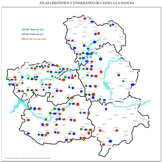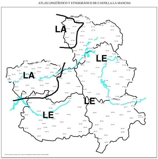 - García Mouton, Pilar, and Francisco Moreno Fernández. 2003. Atlas lingüístico y etnográfico de Castilla—La Mancha (ALeCMan). Available online: http://www.linguas.net/ALeCMan/ (accessed on 15 July 2023).