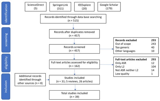 The first search yielded 515 results. In the first place, the duplicate papers were filtered, resulting in 457 articles. Then, a first screening by title yielded 161 results. The main reasons for excluding the studies were out of scope of the topic (243), too general topics on ASR or L2 or language learning in general (40), or papers written in other languages than English (10).