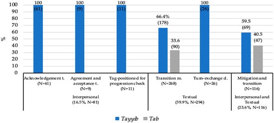 All instances of Tayyib and Tab that function as discourse-pragmatic features were extracted from the corpus. Some tokens of Tayyib and Tab were excluded from the sample. All occurrences of Tayyib that function as an adjective (lit. ‘good, kind-hearted’) were excluded from the dataset (n = 34). Moreover, adopting the convention of the variationist sociolinguistics (), tokens that occur in particular contexts were removed from the sample, including tokens found in direct quotations (n = 21) and interrupted speech (n = 2). Likewise, two Tab tokens were eliminated due to their co-occurrence with the English okay, which results in functional ambiguity. The remaining dataset consists of a total of 491 tokens of the variable TAYYIB (Tayyib n = 354 and Tab n = 137). In addition to coding each token of the variable TAYYIB for its two variants (full Tayyib and reduced Tab), each token was coded for discourse-pragmatic function (i.e., for both macro and micro functions and for functional classifications, see Table 2 below) as well as the social factors: age and gender. Age was coded as young (aged between 18 and 20 years), adult (between 30 and 40 years) and older adult (55+ years), while gender was coded as male or female.