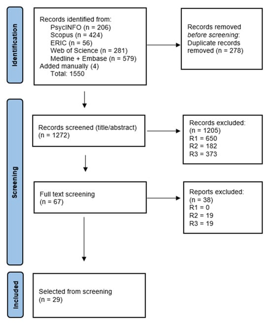 PRISMA flow diagram displaying the study selection process (adapted from Page et al. 2021). R1 to 3 are described in Section 3.1.