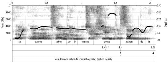 Spectrogram of the sentence La Corona saben de ir mucha gente saben de ir ‘Many people usually go to the Corona!’.