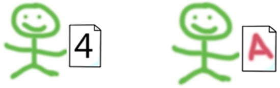 Children completed an elicited production task that contained 24 test items. The experimental task was designed to elicit a past participle in a compound tense with auxiliary verb haber ‘to have/to be’. Children were presented with two pictures side-by-side of a stick-figure character named Pablo (see Figure 2) and were told a short story about the character that ended with the auxiliary verb form hubiera ‘should have’.1 Children were expected to finish the sentence with a participle. For example, in Figure 2, the experimenter pointed to the stick figure writing the number and said En esta historia, Pablo está escribiendo un número ‘In this story, Pablo is writing a number’. Then, she pointed to the stick figure writing the letter A and said pero él hubiera ____ ‘but he should have _____’. The expectation was that children would respond with utterances like escrito un número ‘written a number’. The task included six irregular past participles (Table 3), each elicited in four trials. Following previous research on child heritage speakers in the U.S., no distractor items were included in order to keep the task as short as possible while including sufficient items that enabled analysis of predictor variables (Cuza et al. 2019).