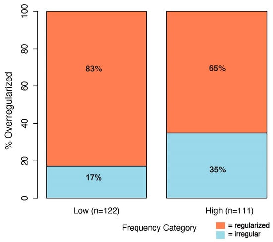 The third research question dealt with the impact of lexical frequency on children’s past participle overregularization. The study included low-frequency past participles escrito, roto, muerto and high-frequency past participles puesto, dicho, hecho (Table 4). The children were more likely to overregularize the low-frequency past participles like roto in contrast to the high-frequency ones like hecho (Table 8). More specifically, children overregularized low-frequency past participles at a rate of 83%, while they overregularized 65% of their high-frequency past participles (Figure 2). Thus, while both low- and high-frequency past participles were overregularized often in the experimental data, the low-frequency forms were significantly more likely to undergo overregularization and be produced as variants like rompido. These results suggest that the more often children are exposed to irregular past participles, the less likely these forms will be overregularized (Bybee 2007).5
