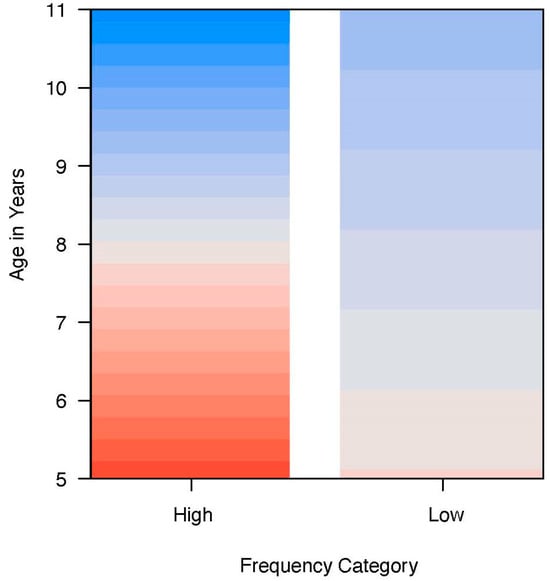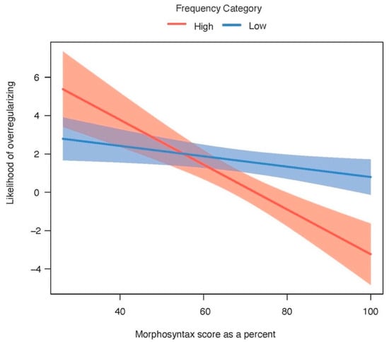 While lexical frequency was a significant predictor of children’s overregularization, with low-frequency past participles increasing the likelihood of an overregularized form (e.g., escribido), it is worth noting that even the high-frequency past participles did undergo quite a bit of overregularization in the current study (65%); however, the interaction between lexical frequency and morphosyntax scores (Figure 5) indicates that overregularization of frequent forms was found among children with lower morphosyntax scores. The higher the children’s grammatical proficiency, the less likely they were to overregularize the high-frequency past participles like dicho. Furthermore, an additional interaction between lexical frequency and age showed that the children between the ages of 5 and 8 years were more likely to overregularize the high-frequency participles like dicho, while these forms were less likely to be overregularized in the older children. Meanwhile, there was no age effect found for the low-frequency participles like escrito. These findings further bolster the conclusion that children’s retreat from overregularization is tied to overall grammatical development and experience with the language.