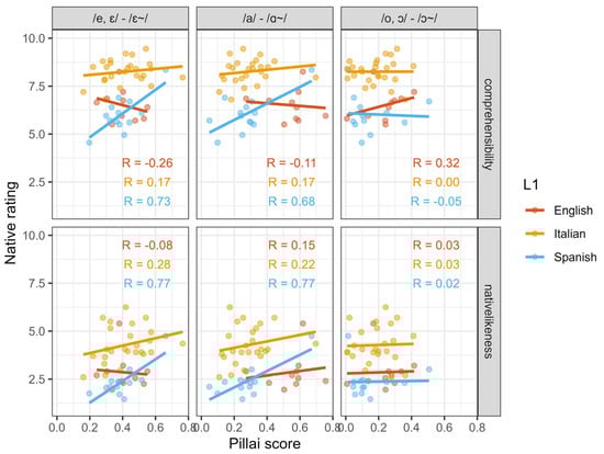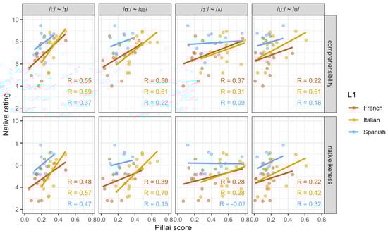 By−participant Pillai scores for each EnglishL2 target vowel contrast, plotted with native ratings of comprehensibility (above) and nativelikeness (below).