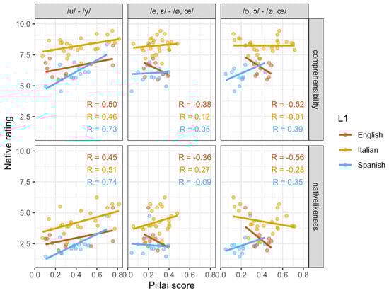 A similar scenario applies for predictions of nativelikeness, where the Pillai score for /y/ — /u/ is the best predictor. In this case, Pillai scores for // — /e, ɛ/ and // — /a/ are also significant, although their contribution seems to be limited, with marginal R2 values of 0.05 and 0.07, respectively.