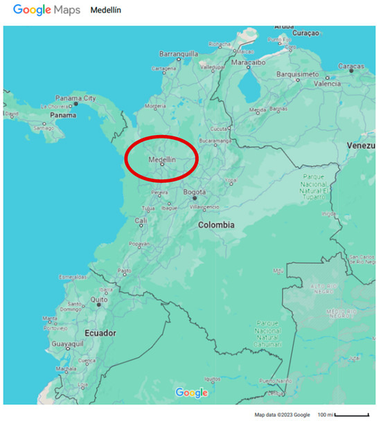 Map of Colombia, with Medellín circled in red. Source: Google Maps, 2023.