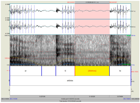 Figure 4. Bad Bunny, <artistas> [aɾ.ˈti.ta], showing two deletions, from YouTube interview.