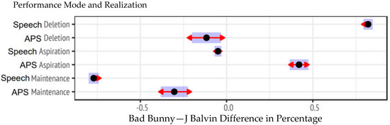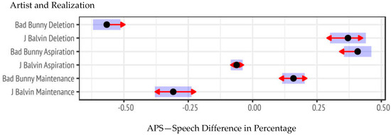 When we consider the artistic performance speech (APS) of each artist, we start to see a difference in trends. Table A1 (see Appendix A) considers the Realization of coda /s/ by Artist in the APS by song. Although, overall, Bad Bunny prefers aspiration to deletion, and J Balvin prefers 50/50 maintenance and deletion, when we look further, there are several examples where Bad Bunny has an almost even split between maintenance, aspiration, and deletion. In “Qué pretendes” with J Balvin, he has 37%/37% maintenance and deletion, and in “Si veo a tu mamá”, he also has very balanced percentages. These songs had enormous followership, so his pronunciation seems intentionally adjusted to allow for more syllable-final -s. Due to negative language attitudes, a more normative pronunciation may have been desired for the songs that would reach a larger audience, such as “Mía” with the Canadian artist, Drake, which has 29% maintenance. Two of the collaborative songs with J Balvin, “Un día”, and “No me conoce”, have deletion rates that are a bit higher than the rest, showing both indexicality and covert prestige. In these two songs, J Balvin also has slightly higher maintenance rates than in his overall APS, so in these songs, they stay the truest to their spontaneous speech realization rates.