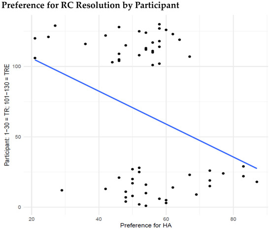 The participants in group TR (Figure 13), who were tested in their native language Russian, demonstrated a different processing pattern at the RespTime. They had difficulty interpreting the sentences with the incongruent processing conditions, i.e., where the matrix verb prompted HA but social conventions prompted LA.