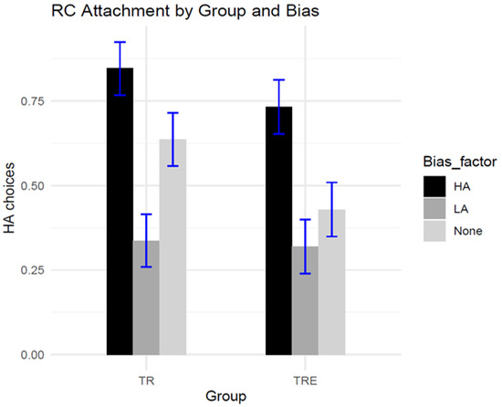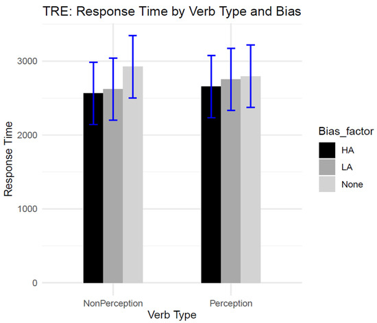 The interaction of factors Verb type and Social bias worked differently in each group. There was a significant interaction for Verb type * Social bias * Group (β = −747.3, SE = −2.27, z = −2.27, p = 0.02). Figure 12 and Figure 13 demonstrate the results in groups TRE and TR, respectively.