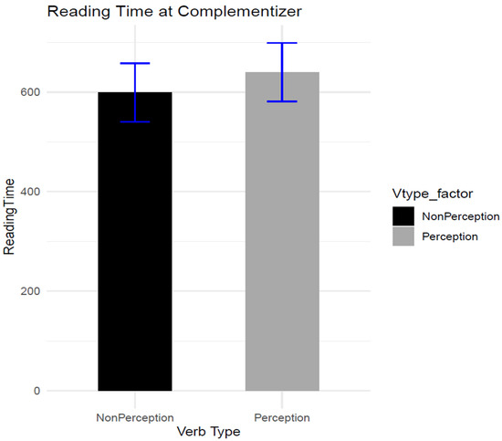 There was a significant effect of Verb type (β = 41.6, SE = 19.8, z = 2.11, p = 0. 03) on the RT at the complementizer that in both groups. In sentences with a perception verb, the participants slowed down their RT upon encountering the complementizer (see Figure 7).
