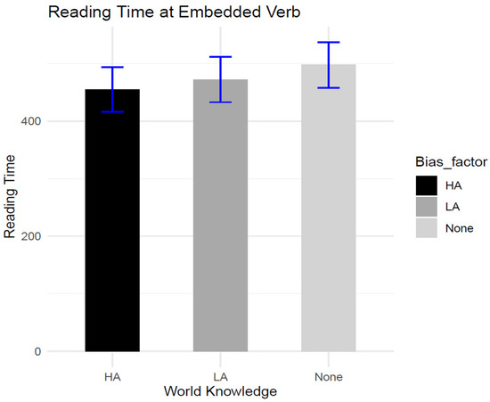 There was only one significant factor that influenced the RT at the embedded verb—Social bias (β = 29.4, SE = 13.3, z = 2.12, p = 0.03); the data are illustrated in Figure 8. There was no effect of Verb type or Group on the RT at the embedded verb.