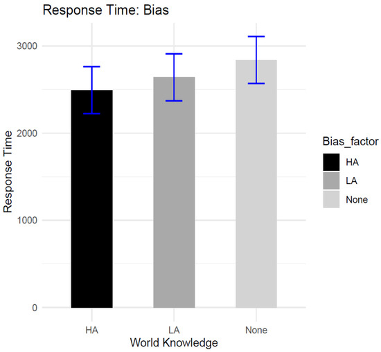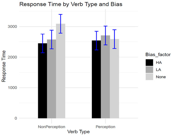 The effect of Social bias on RespTime is demonstrated in Figure 11. The established sensitivity to Social bias (see Figure 8 and Figure 9) was maintained in the ‘non-perception’ condition, Figure 11. In sentences with a perception verb, the pattern changed, and sentences where Social bias favored LA became more difficult to interpret.