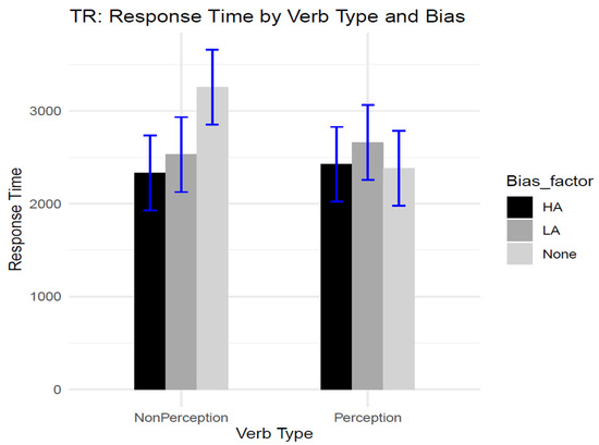 Figure 10 illustrates the RespTime in each group. The participants tested in Russian (TR) found the sentences with a perception verb easier to interpret than the sentences with a non-perception verb. Group TRE did not show any effect of a perception verb on RespTime.