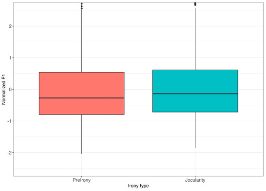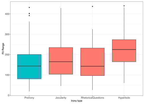 All of the models were constructed using the lmer function within the lme4 package (Bates et al. 2015) in RStudio (RStudio Team 2023), with ggplot2 (Wickham 2009) used for the data visualization. We constructed two types of models. The first, a linear regression model taking pitch range as its dependent variable, was at the utterance level. The values for the pitch range measure were derived by taking the maximum and minimum pitch over the entire pre-ironic and ironic utterances and finding the difference between them (maximum − minimum). There were two predictors, namely the irony type (with “pre-irony” as the baseline value, so the pitch range values of each irony subtype would be compared to the pitch range values of the pre-ironic baseline utterances) and speaker age, and two random effects, namely one random intercept per speaker, and one random intercept for each pairing of the pre-ironic and ironic utterances nested within each speaker. This accounts for any potential clustering or grouping effects per speaker as they produce their utterances. The remaining variables (syllable stress, vowel, etc.) were not included in the model because the pitch range measure derived from the utterance as a whole, rather than from each syllable.
