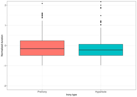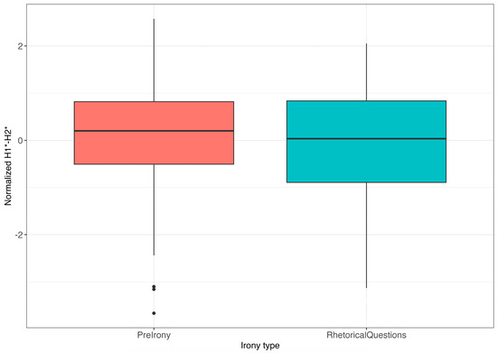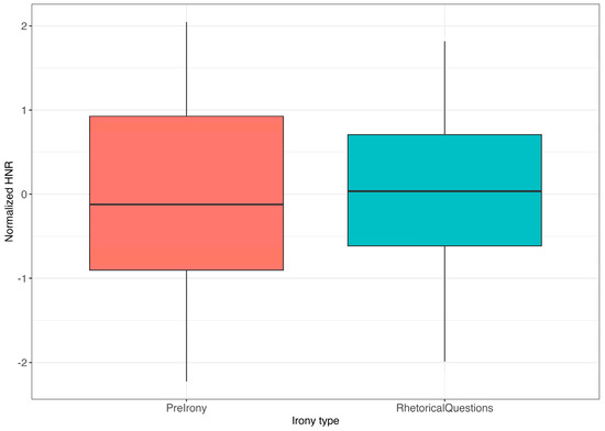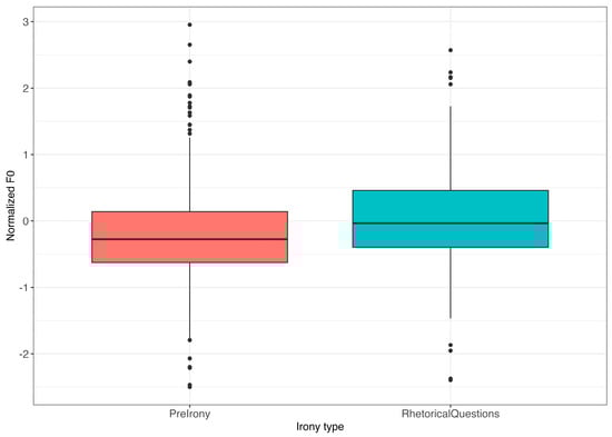 The second hypothesis states that ironic utterances will be prosodically differentiated from non-ironic utterances via several measures. First, we expect longer syllable durations in all ironic utterances (cf. Bryant 2010). We also expect lower F0 (Rao 2013; Cheang and Pell 2008; Attardo et al. 2003) and differences in voice quality (Niebuhr 2014; Cheang and Pell 2008) in sarcastic utterances. Rhetorical questions are one of the subtypes of speech acts used by Gazdik (2022) in her examination of the use of the tag question ¿No? in Peninsular Spanish, and the author finds that nearly all occurrences of ¿No? as a tag question use a rising contour. For this reason, we expect to observe rising intonation (increased F0 toward the end of the utterance) in rhetorical question irony types. As previous work in Spanish has not explicitly included other irony subtypes, we generally expect that we may find differences along each of the five acoustic measures examined here (F0, F0 range, syllable duration, and two measures of voice quality, namely H1*–H2* and HNR, explained below). We also expect that some of these measures may overlap. That is, given that humor may be signaled in myriad ways, it is possible that the same measures may act in similar ways across different types of verbally ironic utterances, since prosody is a paralinguistic feature that “helps speakers communicate a wide array of affect and intentions” (Bryant 2010, p. 548).