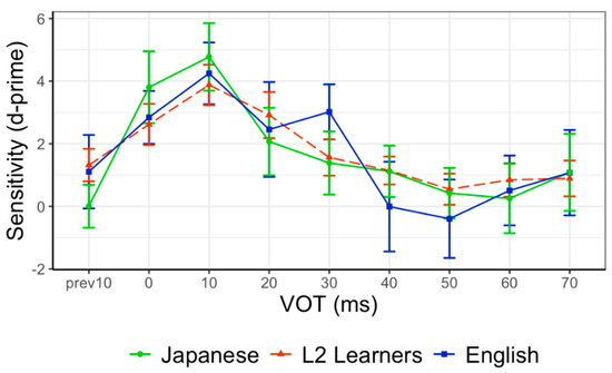 While the discrimination peak is expected to be around 20–30 ms for both monolingual groups (Shimizu 1977, for Japanese; Mack 1989, for English), Lisker and Abramson (1970), as cited in Abramson and Lisker (1973), reported a higher VOT boundary for English speakers at around 35 ms. Therefore, it is possible that monolingual English speakers show higher sensitivity in the discrimination of stimuli with longer VOTs, on average, compared to monolingual Japanese speakers. More importantly, if L2 English learning influences the learner’s perception via exposure to longer VOTs, it is possible that the sensitivity pattern of the L2 group would be more similar to that of English speakers in contrast to the monolingual Japanese group.