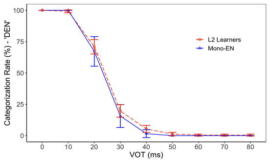 Categorization function of English “den”–“ten”. Error bars indicate 95% CI.