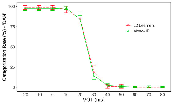 Categorization function of Japanese “dan”–“tan.” Error bars indicate 95% CI.
