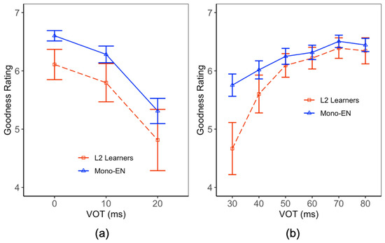 In order to analyze the English goodness rating results, we first focused on stimuli whose onset VOTs were longer than 30 ms so as to examine potential group differences in rating /t/-like onsets. Then we adopted the same method to examine group differences in rating /d/-like onsets. This method was used because each participant only rated consonants that they categorized. In other words, for each trial, participants were first asked if the given stimulus sounded like /den/ or /ten/ and were then asked to rate how closely it sounded to the consonant they chose (i.e., /d/ or /t/). Because of this design, fewer stimuli with short VOTs (ms) were rated as /ten/. We chose stimuli with 30 ms to 80 ms as stimuli with /t/-like onsets. This range (30 ms to 80 ms) was chosen because the categorization task result indicated a perceptual category boundary between 20–30 ms. We focused on stimuli with longer than 30 ms VOTs so that we could examine the rating pattern differences in stimuli that were most consistently judged as /t/, as well as the difference in stimuli that were consistently judged as /d/ (Figure 4).