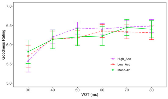 A total of 18 L2 learner participants (out of 61) produced L2 English VOTs within two standard deviations of the monolingual English speakers’ group mean. Given that less than half of the L2 learner participants were able to produce relatively more nativelike English VOTs (long VOTs), it is possible that the overall L2 learners’ tendencies to give higher ratings for longer Japanese VOTs were driven predominantly by the subgroup of learners who can produce long VOTs in L2 English. As a post hoc analysis, we grouped L2 learner participants based on their L2 English /t/ production into high-accuracy (in production) and low-accuracy groups.7 The high-accuracy group (N = 30) consisted of L2 learners whose individual mean VOTs for /t/ were within 2SD of the English monolingual mean8. The remainder of the L2 learners were added to the low-accuracy group (N = 31).