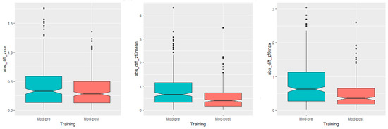 With respect to the first hypothesis, i.e., learners converge prosodically towards the native speakers after the training, the data in Figure 1 left, center and right display that the difference towards the native model was lower in post-training (Mod-post) than in pre-training (Mod-pre) productions for all examined acoustic parameters. This trend is confirmed by the statistical analysis, which showed a significant main effect of training session on the absolute difference in duration (F(1) = 8.4075, p = 0.003905), F0 mean, (F(1) = 36.984, p < 0.001), and F0 max (F(1) = 51.35, p < 0.001) between the learners and the model.