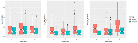 With respect to our second hypothesis, i.e., the effect of the training varies according to the speech act, with “granting” showing the most noticeable approximation towards the L1 speaker, Figure 2 left, center, and right illustrate that the absolute distance between the learners and model decreased in post-training productions (Mod-Post), with appreciable differences between speech acts and measures. From a visual inspection of the data, indeed, it appears that for duration (Figure 2 left), the differences between pre- and post-training look marginal for all speech acts, whereas for both F0 measures (Figure 2 center and right), the effect seems larger for the request and command but smaller for granting.