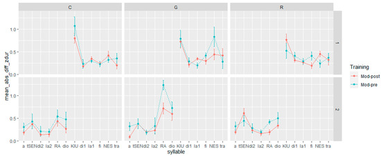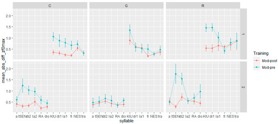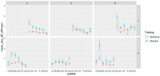 - Step 4: We calculated the absolute difference in duration, F0 mean, and F0 max between the syllables in the L1 Italian corpus and the corresponding syllables in the pre- and post-training corpora (henceforth Mod-Pre and Mod-Post). In the calculation of the distance between the L1 and L2 productions, we adhered to the gender-matching criterion applied in prosodic transplantation and self-imitation training. Hence, in the computation of Mod-Pre and Mod-Post, we matched the syllables of the female L1 speaker with those produced by the female L2 learners and, likewise, the syllables of the male L1 speaker with those of the male L2 learners.