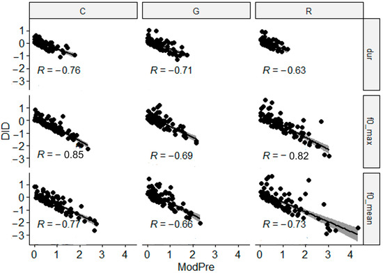 Regarding the third hypothesis, i.e., the baseline acoustic distance between the learners and the model influences the amount of convergence towards the native speaker, the results depicted in Figure 6 show a significant moderate negative correlation between the baseline distance (Mod-Pre) and the amount of convergence after the training (DID). In other words, the larger the baseline acoustic distance between the model and the learners, the greater the convergence in post-training production, as evidenced by negative DID scores.
