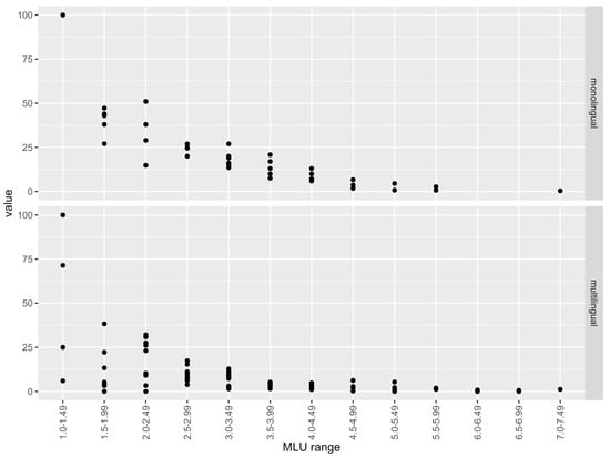 Figure 2 shows that the bilingual children reach the value 0% of subject omissions earlier (at a lower MLU) than the monolingual children. The difference between the groups disappears at an MLU between 3.5 and 5.0. Unfortunately, MLU values do not exist for each MLU range in the children. More data are needed.