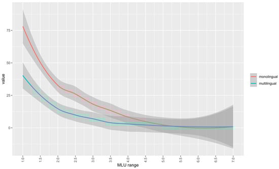 A linear mixed-effects model shows (with larger MLU phases, due to the absence of data, dependent variable: % of target-deviant omissions) that the two groups differ significantly at stage 1 (1.0–2.99) (p < 0.001), at stage 2 (3.0–4.99) the difference is slightly significant (p < 0.089), and at stage 3 (5.0–7.49) there are no indications of a difference (p = 0.878).