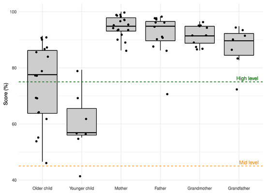 Proficiency test scores in Russian: boxplots of family members’ performance (levels: 100–75% high; 74–45% mid; under 44% mid-low).
