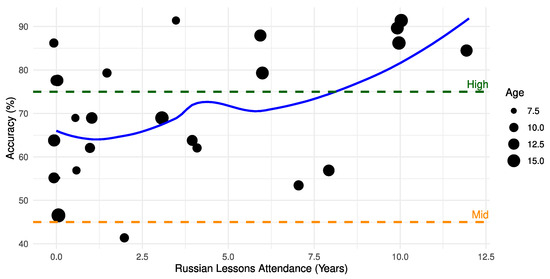 Böhmer (2016) shows in her study that bilingual children who were exposed to Russian literacy instruction perform better in both of their languages than those who did not have this kind of structured input. Through linear regression analysis, we assessed the impact of Russian lesson attendance on language proficiency scores, which yielded a positive correlation: Each year spent in Russian classes correlates with a 1.71-point score increase (p = 0.024), signifying a substantial benefit of prolonged instructed input for developing language skills (see Figure 2). However, this factor accounts for only about 20% of score variation (R-squared = 0.2025), indicating that other influential factors are at play. Thus, our findings emphasize an important but not decisive role of Russian language instruction for boosting proficiency in the heritage language. Moreover, the analysis reveals that age does not have a significant impact on scores, indicating the consistent effectiveness of Russian lessons across different age groups.