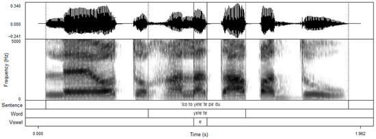 Target word and target vowel boundaries for the phrase Λέω το γαλατά παντού [ˈlεo to ɣɐlɐˈtɐ pɐˈdu] ‘I say the (word) milkman everywhere’.