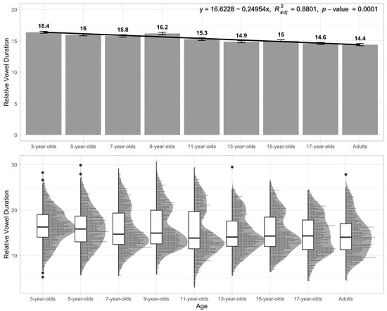 Means and standard errors of relative vowel duration across different age groups are shown at the top, including the regression analysis results examining the relationship between relative vowel duration and age. The bottom part of the figure displays the distribution of data for relative vowel duration by age. Some distributions exhibit a double peak due to how the data are spread across the different stress conditions.