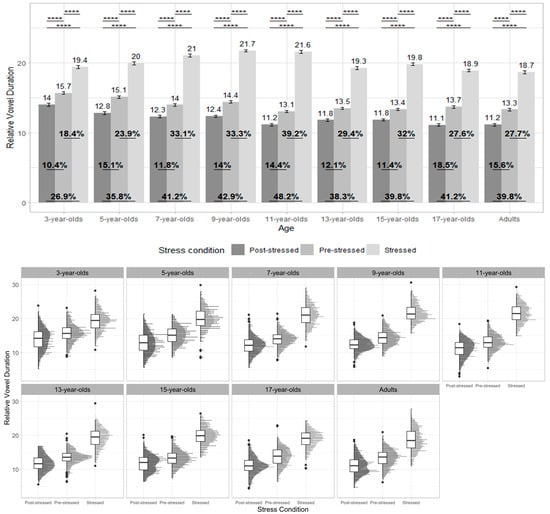 Means and standard errors of relative vowel duration, categorized by age and stress condition, are shown at the top, including statistically significant differences and the degree of vowel reduction between the stress conditions within each age group (****: p < 0.0001). The bottom part of the figure displays the distribution of data for relative vowel duration by age and stress condition.