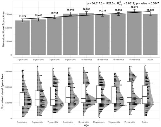 A significant increase in normalized vowel space areas with age was shown by the regression analysis (p = 0.0047, R2adj = 0.6619) (see Figure 4). The main effect of age was statistically significant in the linear mixed-effects model analysis (F (8, 54) = 4.411, p = 0.0004, ηp2 = 0.4), with Tukey’s post hoc tests revealing that three-year-olds exhibited significantly smaller areas than adults. Moreover, the main effect of gender reached statistical significance (F (1, 54) = 4.936, p = 0.0305, ηp2 = 0.08), with females (74,779) exhibiting significantly larger normalized vowel space areas than males (71,469). The statistically significant Gender × Stress interaction (F (2, 972 = 6.497, p = 0.0016, ηp2 = 0.01) showed that these gender-related differences were significant only in the stressed condition.