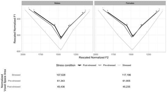 F′1 × F′2 vowel space and means of their areas by gender and stress condition.