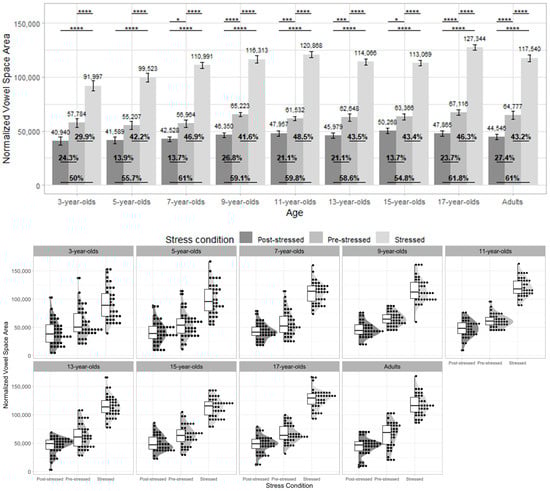 Means and standard errors of normalized vowel space areas, categorized by age and stress condition, are shown at the top, including statistically significant differences and the degree of vowel reduction between the stress conditions within each age group (****: p < 0.0001; ***: p < 0.001; *: p < 0.05). The bottom part of the figure displays the distribution of data for normalized vowel space areas by age and stress condition.
