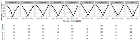 The results showed that the main effect of vowel was statistically significant (F (4, 5157) = 6178.43, p < 0.0001, ηp2 = 0.83); Tukey’s post hoc tests showed that Euclidean distances from the centroid of the acoustic vowel space decreased in the order [i] (432.5) > [u] (389.5) > [o] (166.4) > [ε] (142.9) > [ɐ] (125.6), where all differences among vowels were statistically significant. However, different interactions (Age × Vowel: F (32, 5157) = 5.58, p < 0.0001, ηp2 = 0.03; Age × Gender × Vowel: F (45, 5157) = 2.54, p < 0.0001, ηp2 = 0.02) indicated various patterns in Euclidean distances among vowels across different ages and genders. The only consistent observation across age and gender groups was that the high vowels [i, u] had significantly larger Euclidean distances compared to the other vowel qualities, [o, ε, ɐ] (see Figure 7 (bottom) for the mean Euclidean distances across different age groups).