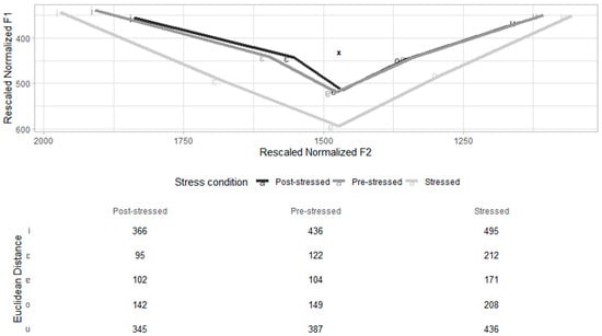 F′1 × F′2 vowel space by stress condition (top) and the means of Euclidean distances, categorized by stress condition and vowel (bottom). X indicates the centroid of the acoustic space at the top panel.