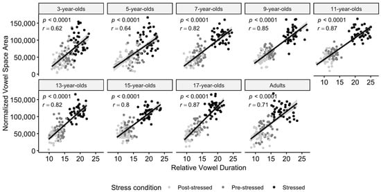 Figure 10 shows strong to very strong Pearson’s correlations between relative vowel duration and normalized vowel space areas across ages. In particular, strong correlations were evident in the younger age groups, namely in three- and five-year-olds (r = 0.62 and 0.64, respectively), followed by adults (r = 0.71), while very strong correlations were found in the remaining age groups (r = 0.8–0.87). In spite of the differences in the correlation coefficient across ages, a consistent pattern emerged across all age groups: For both relative vowel duration and normalized vowel space areas, the stressed condition consistently exhibited the highest values, followed by the pre-stressed condition, and then the post-stressed one.