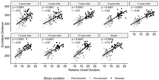 The Pearson’s correlation results between relative vowel duration and Euclidean distances were similar to those of the correlations between relative vowel duration and normalized vowel space areas. As shown in Figure 11, strong correlations were evident for three- and five-year-olds (r = 0.57 and 0.62, respectively), followed by adults (r = 0.72), and then very strong correlations were found for the other child groups (r = 0.81–0.85). Moreover, across all age groups, higher values were observed for both relative vowel duration and Euclidean distances in the stressed condition, followed by the pre-stressed and then the post-stressed conditions.