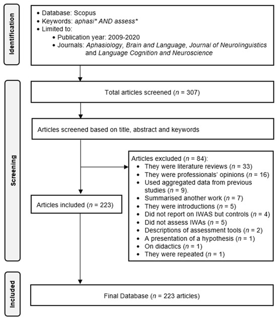 The inclusion criterion was empirical studies reporting on new data on IWA language assessment. Some of the articles automatically searched did not meet the inclusion criteria, as they did not evaluate people with aphasia or they were reviews of the literature (cf. Beveridge and Bak 2011); thus, 84 articles were not included in our sample. Among these 84 articles, 33 were literature reviews, 16 were professional’s opinions, 9 articles used data based on previous research, 7 others summarised another work, 5 were introductions, 4 were not from IWAs but rather a control group, 5 did not assess IWAs, 2 articles were a description of an assessment tool, 1 was a hypothesis, 1 was on didactics and, finally, 1 article was repeated in two different years. Thus, the final sample constituted 223 articles (Figure 1). A list of the articles included in the sample is provided in Supplementary Materials.