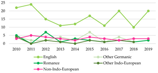 Moreover, we examined whether this trend is constant or variable year after year, studying the annual diversity of main languages or language groups. As observed in Figure 3, as far as English is concerned, this language predominates year over year, with a great difference from the other languages. In addition, no other remarkable result is observed apart from the slight increase in Romance languages in 2012 and the one in other Germanic languages in 2015. Overall, the trends remained similar between 2010 and 2019.