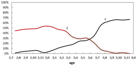There are 17 Greek words with WI /ɾ/ for a total of 245 tokens. The monthly tokens are 10 (at 2;7), 5 (2;8), 25 (2;9), 19 (2;10), 5 (2;11), 33 (3;0), 7 (3;1), 29 (3;2), 22 (3;3), 21 (3;4), 14 (3;5), 16 (3;6), 17 (3;7), 8 (3;8), 8 (3;9), 3 (3;10), and 3 (3;11). At age 2;7, Greek WI /ɾ/ is overwhelmingly substituted by [l], except when deleted. Examples of words include ρόζ [∅oz] “pink” (2;9), ρίξουμε [litsumɛ] “throw” (2;10). The monthly tokens of /ɾ/ deletions are: 1 (2;7), 1 (2;8), 2 (2;9), 1 (2;10), 0 (2;11), 2 (3;0), 1 (3;1), 4 (3;2), 3 (3;3), 2 (3;7), 1 (3;8), 1 (3;9). Deletions are evidenced in ρυζάκι [∅izaci] “rice” (diminutive) (2;7), ρωτήσω [∅otiso] “ask” (2;8), ρόδι [∅oði] “pomegranate” (3;0), ρύζι [∅izi] “rice”, ρυάκι [∅iɐci] “brook” (3;7). Figure 1 shows the child’s longitudinal development of Greek /ɾ/→[ɾ] and its main /ɾ/→[l] substitution. We can see that as /ɾ/ accuracy increases, /ɾ/→[l] recedes, creating a mirror effect. The child’s Greek /ɾ/ accuracy reaches the 70% acquisition criterion (e.g., Ingram et al. 1980) around age 3;9, as shown by the solid black line in Figure 1.