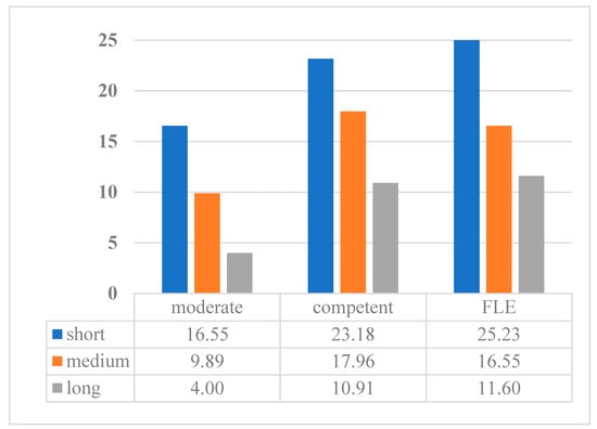 Concerning the first research question (How do SLE participants of different proficiency score on retelling stories of increasing length, compared to FLE participants?), the results for the three groups (moderate, competent and FLE) on the three story lengths are shown in Figure 1. It can be seen that the scores for the moderate group fell most sharply after the short story, whereas the competent group showed a less pronounced decline. The scores for the competent and FLE groups showed a complex pattern. On the medium-length text (Story 3), the competent group scored higher than the FLE group. This did not occur for the long story 4. A more detailed analysis on this is provided below.