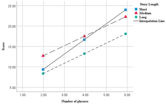 Overall, the regression analyses indicated that the number of phrases used in the retelling of the stories significantly contributed to the total scores across all story lengths (see Figure 2). The moderation effect of proficiency level was not significant for the short stories but was significant for the medium and long stories. This suggests that higher proficiency learners were better able to use phrases effectively in more complex storytelling contexts, leading to higher scores. The number of recalled phrases was lowest for the long story, and this indicates how the highest-scoring participants also did not repeat all phrases verbatim. Conversely, on the short stories, accurate recall of the phrases was highest, almost certainly due to the lower burden on working memory.