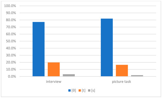 Indeed, despite the overlap between local and standard realizations, use of [θ] was still more frequent in the picture-naming task, whereas use of the urban variant [t] was more prevalent in the interview context, as Table 2 and Figure 1 below indicate. The urban fricative [s] was used highly sporadically in both contexts, but it still surfaced more in the interview than in the picture-naming task. The differences in using [θ] and [t] across contexts were found to be highly significant (p = 0.002 for [θ] and p = 0.001 for [t]).